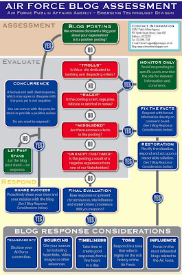 Leyendo Webstrategist.com encontré este diagrama en el cual la Fuerza Aérea de Estados Unidos organiza su estrategia de respuesta a las blogósfera.