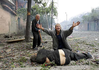 En la foto dos ancianos de Georgia lloran el cadáver de un pariente poco después del cese de un bombardeo. (Foto: Gleb Garanich/REUTERS). Hace unas horas Georgia declaró formalmente la guerra a Rusia.
