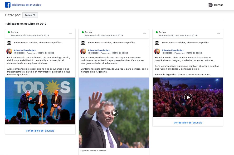 Información detallada de los anuncios y campañas publicitarias: Cuando el usuario clickea para ver más detalles puede ver quien publica el anuncio y que otros anuncios están corriendo en ese momento, y además ver que otros anuncios creó anteriormente. En el ejemplo, vemos la información de Frente de Todos.