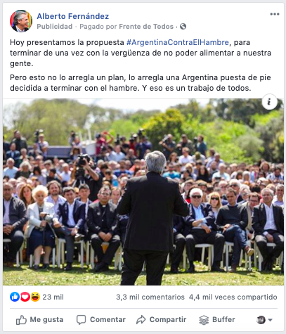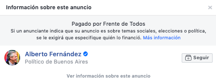 Cuando vemos los anuncios de un candidato se muestra claramente quien es el que paga la publicidad. En este ejemplo, vemos un posteo sponsoreado de Alberto Fernández y la aclaración que está pagado por Frente de Todos, es decir su propio partido político.