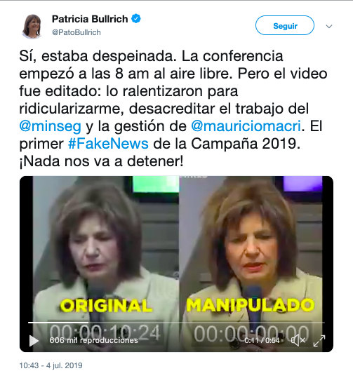 En Julio circulo un video de Patricia Bullrich donde se la veía despeinada y balbuceando en una conferencia de prensa dando la impresión de estar alcoholizada.